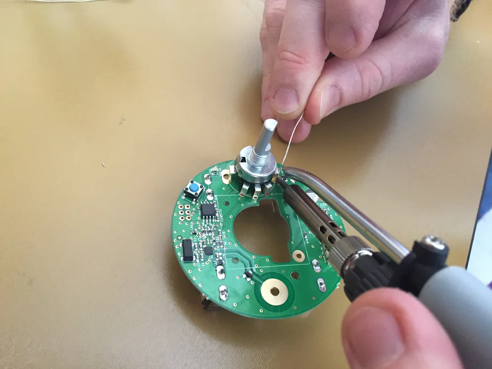 Now take the potentiometer, drop it into the PCB, making sure that it's fully seated in place and solder it up. We find it easiest to 'tack' the pot in place from the topside, then flip it over to finish soldering from the pads on the bottom side.