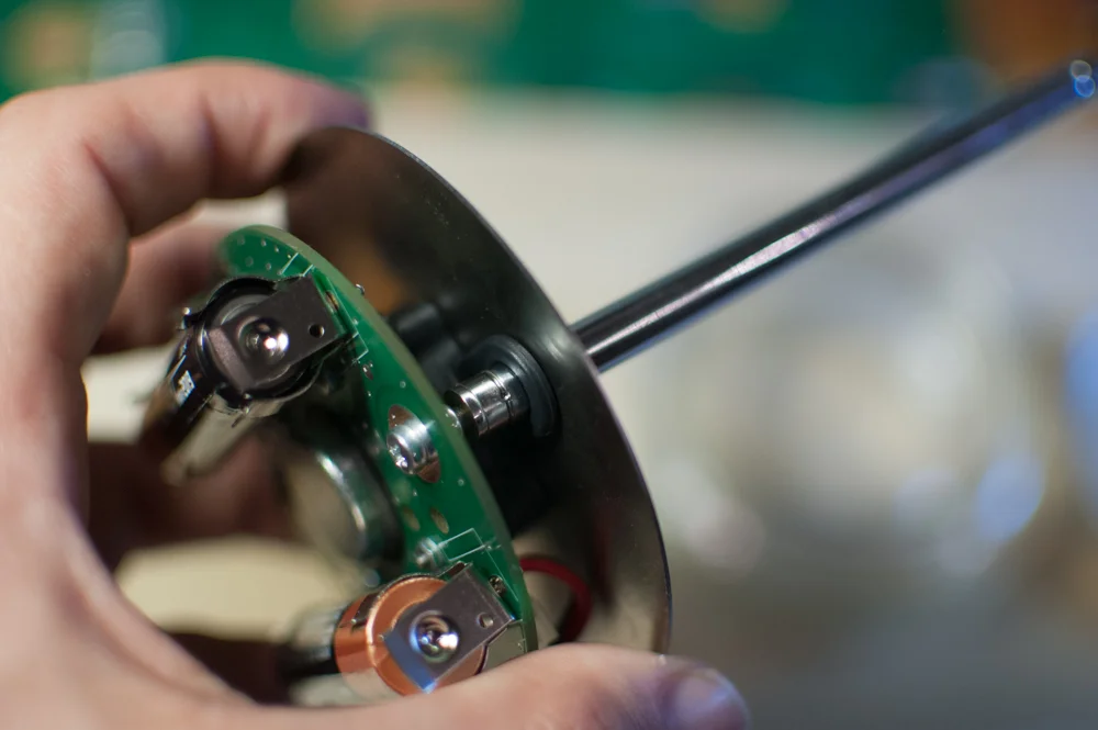 Now install the antenna through the lid and thread it onto the screw. Install the batteries, taking note of their orientation.